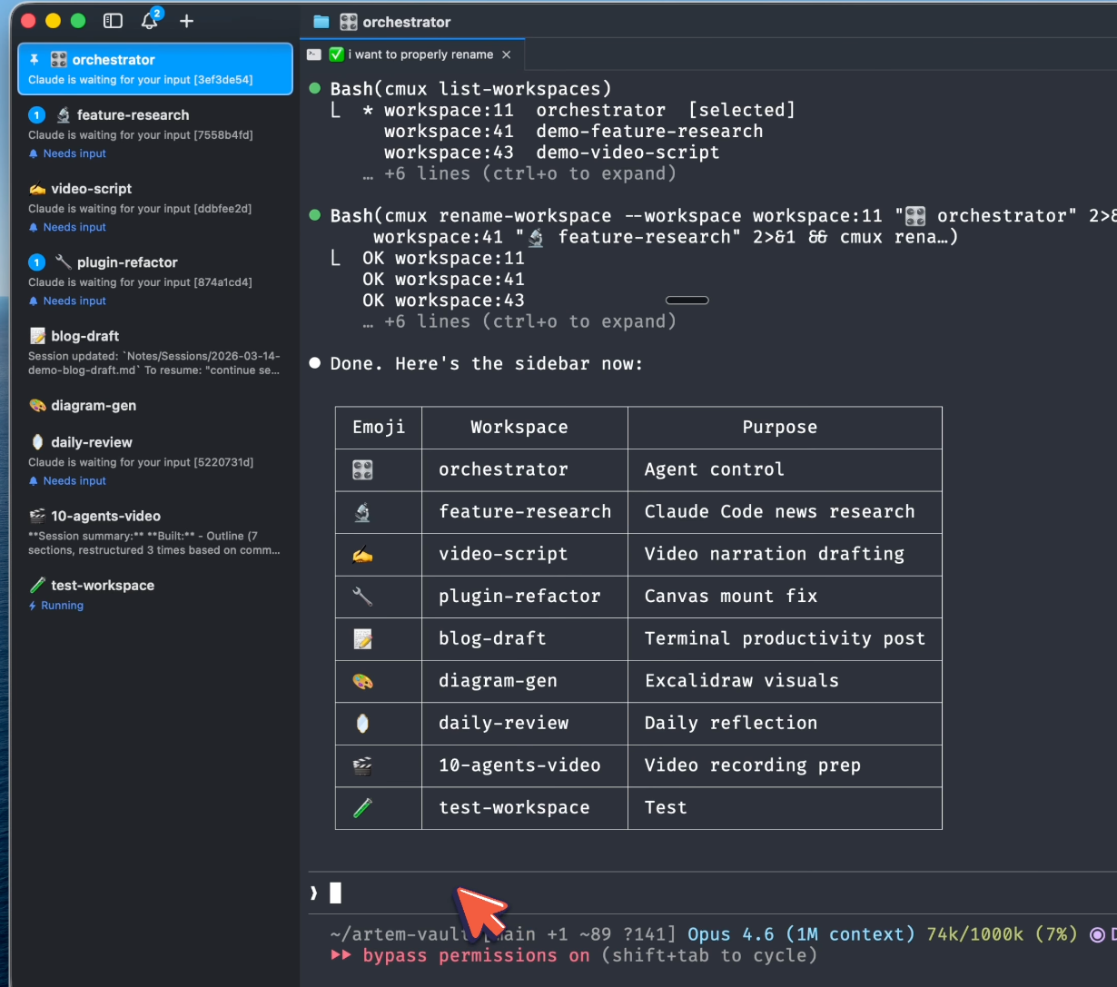 cmux list-workspacesThe orchestrator sees all workspace names, not “tab 4.”