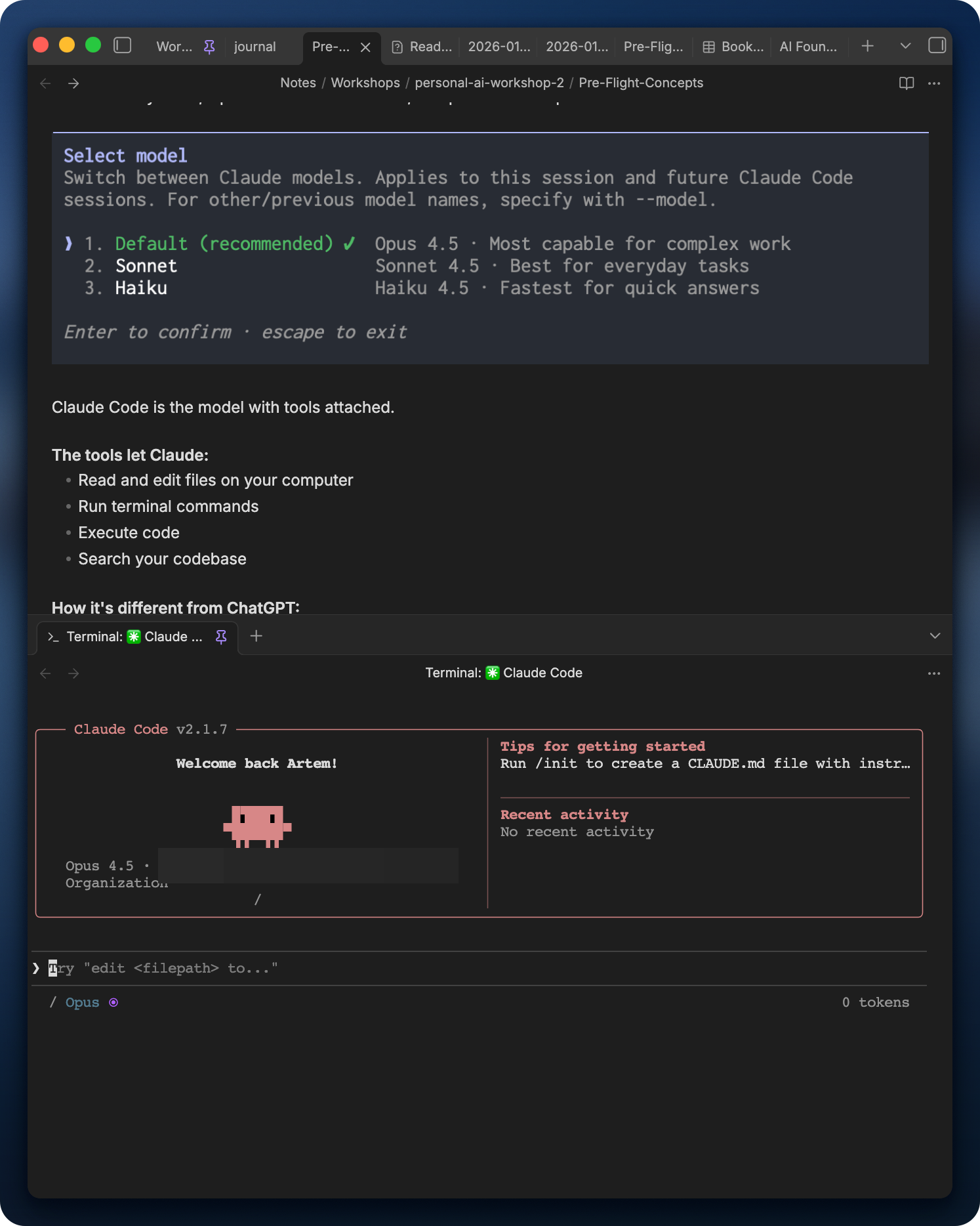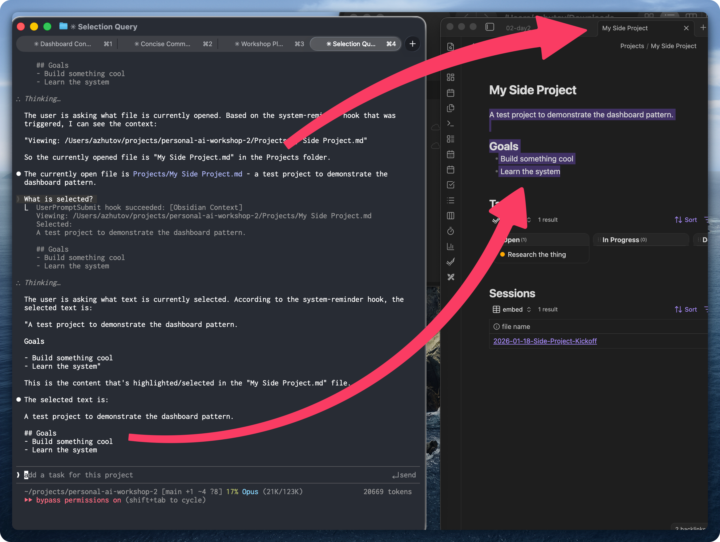 | Terminal + Obsidian side-by-side | Full observability. See Bases, Dataview update in real-time. Full control over settings. | Two windows |