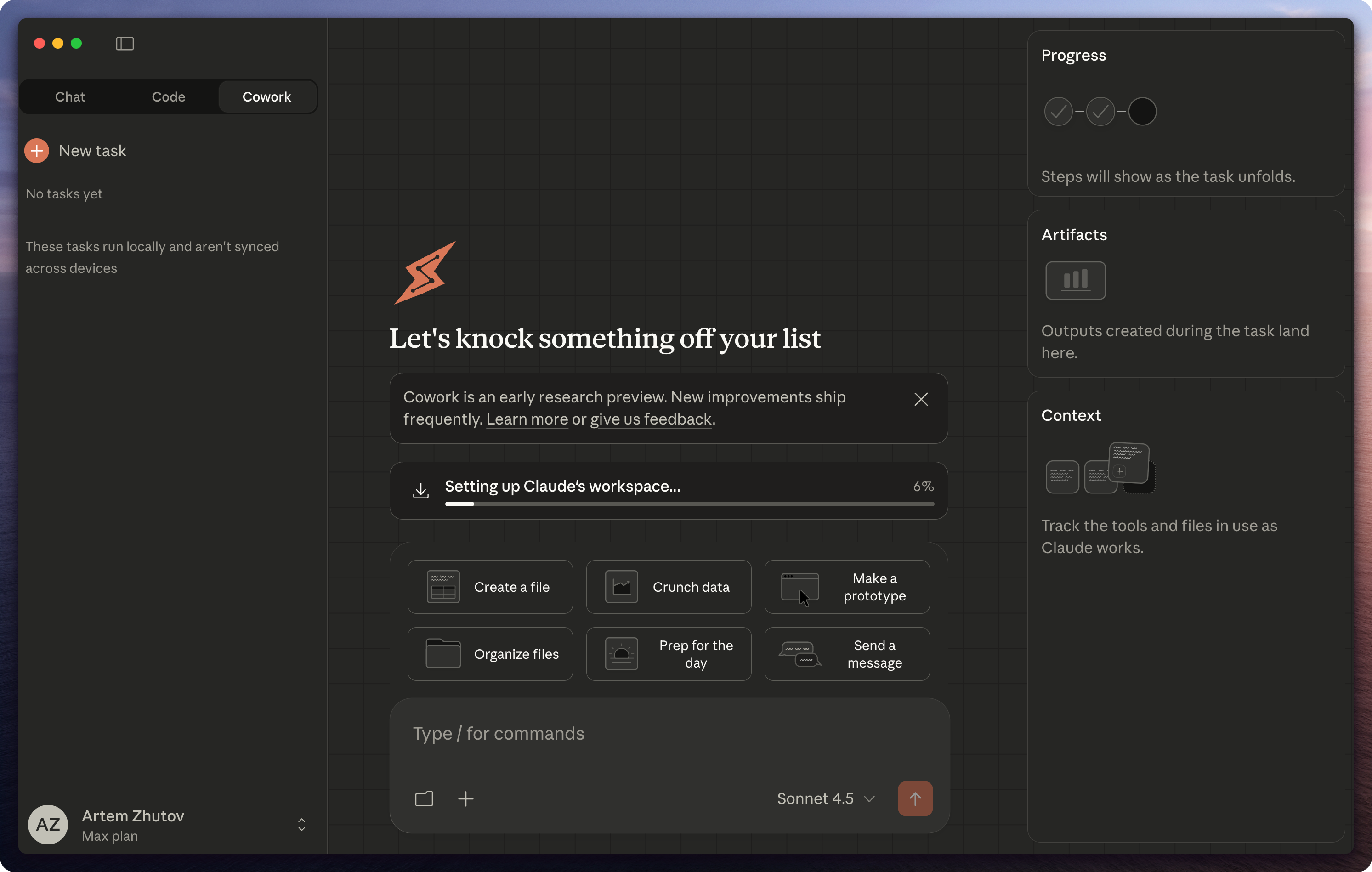 Cowork can render artifacts like in the web version, which might be cool. But all my artifacts are in Obsidian. I can ask Claude to open them, so I don’t really have that need.