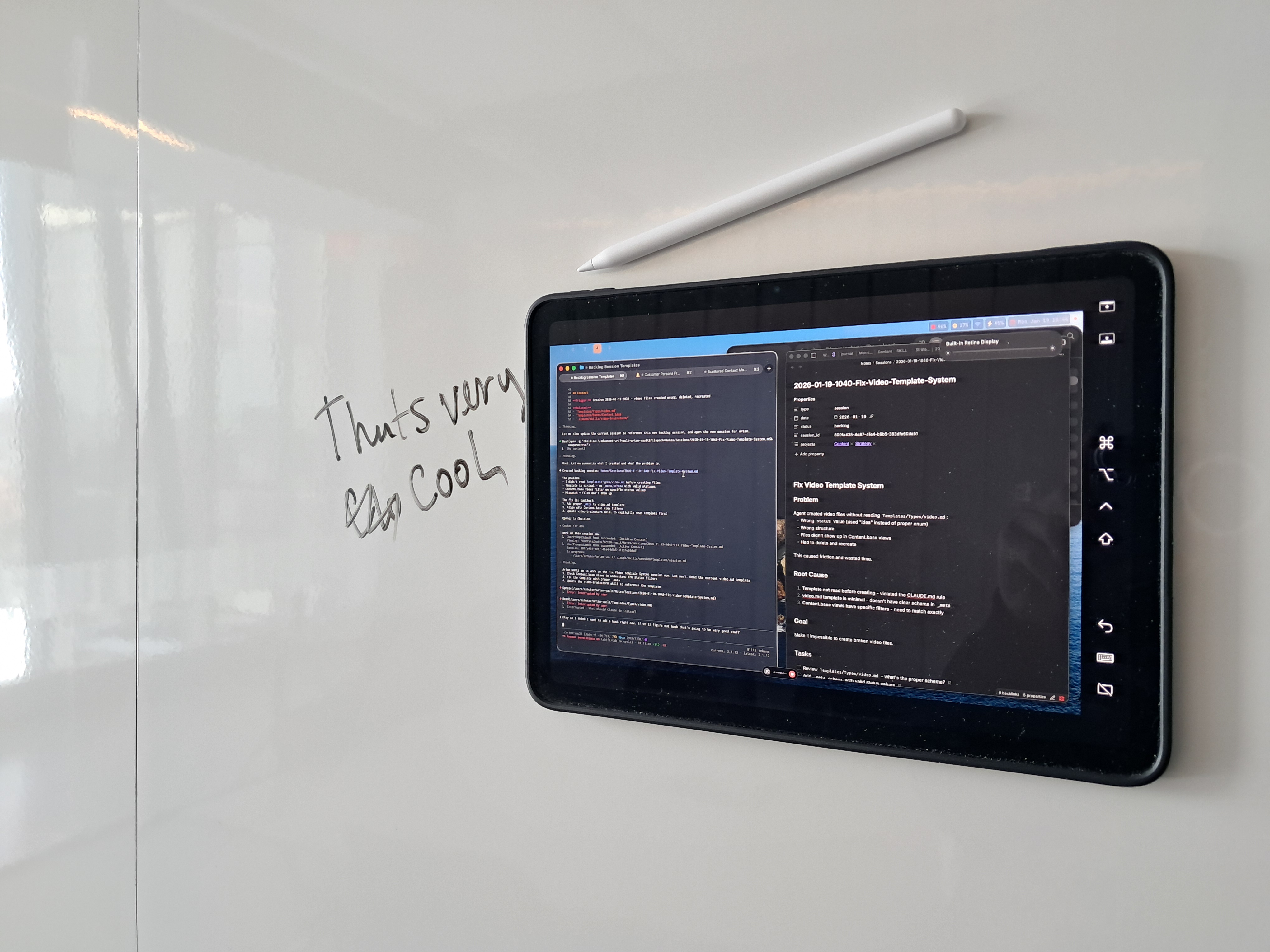 I discovered something: I can put an iPad on a whiteboard and mirror screen from my Mac. I have a hardware trigger for Wispr Flow and a wireless mic, so I can be anywhere in the room. Wispr Flow transcribes my voice at a click of a button. I have another trigger for long press that sends the message to Claude.
