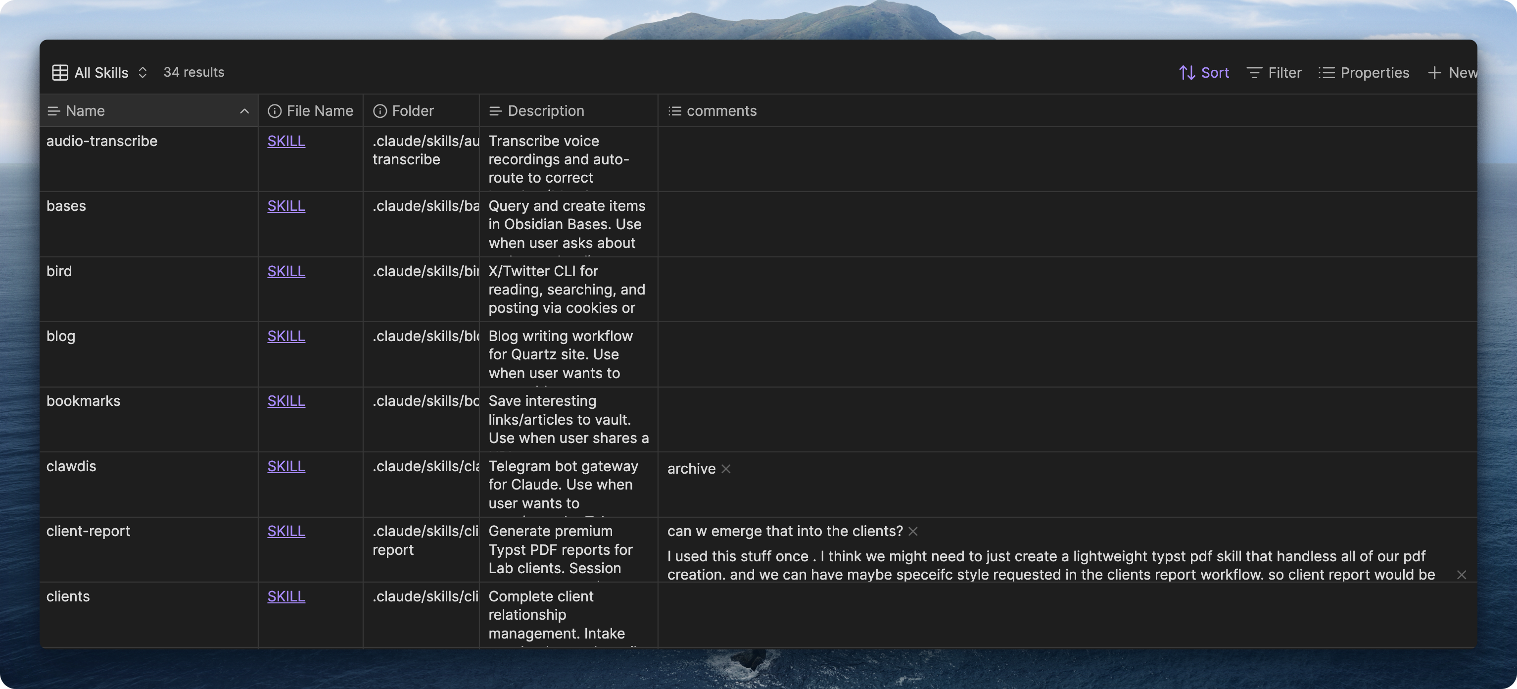 Another thing that was helpful is to create a curated list of skills using Obsidian Bases. It becomes an observability tool for your skills - you can see all of them, their descriptions, and add comments about how to improve or merge different skills.