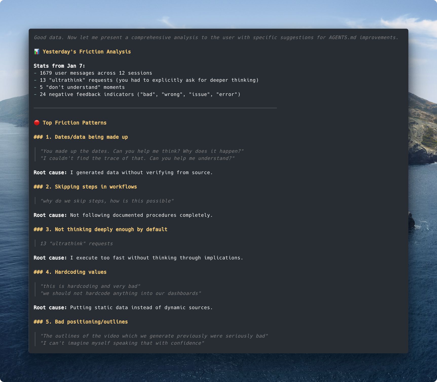 Here’s actual output from analyzing one day: 1679 user messages across 12 sessions. Top friction patterns: dates being made up, skipping steps in workflows, not thinking deeply enough, hardcoding values. Each pattern has root cause and specific quotes. This feeds directly into CLAUDE.md improvements.