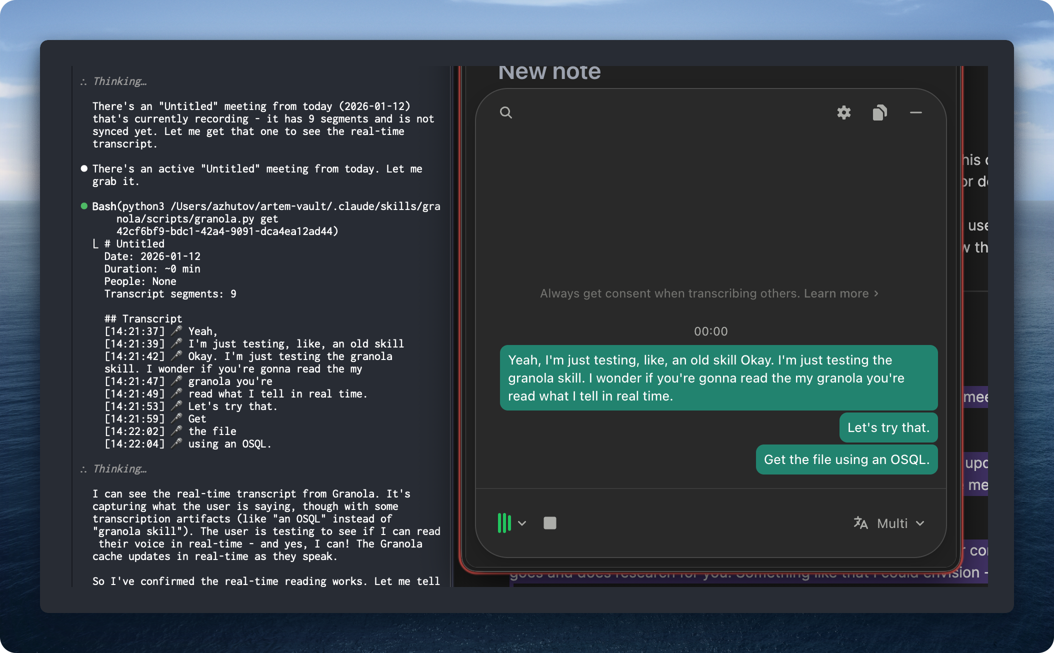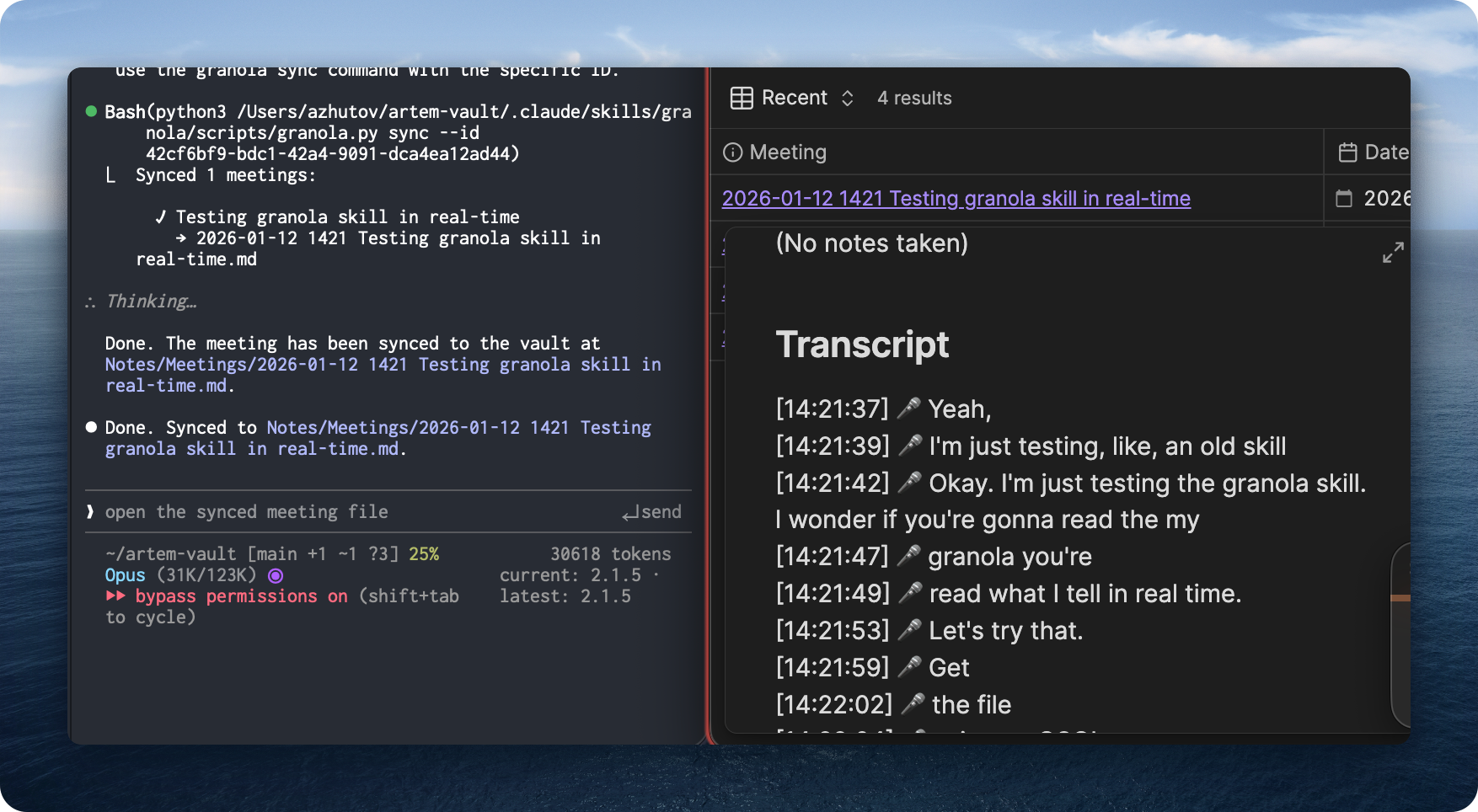 Here’s the real-time workflow - Granola recording on the right, Claude fetching the transcript on the left: