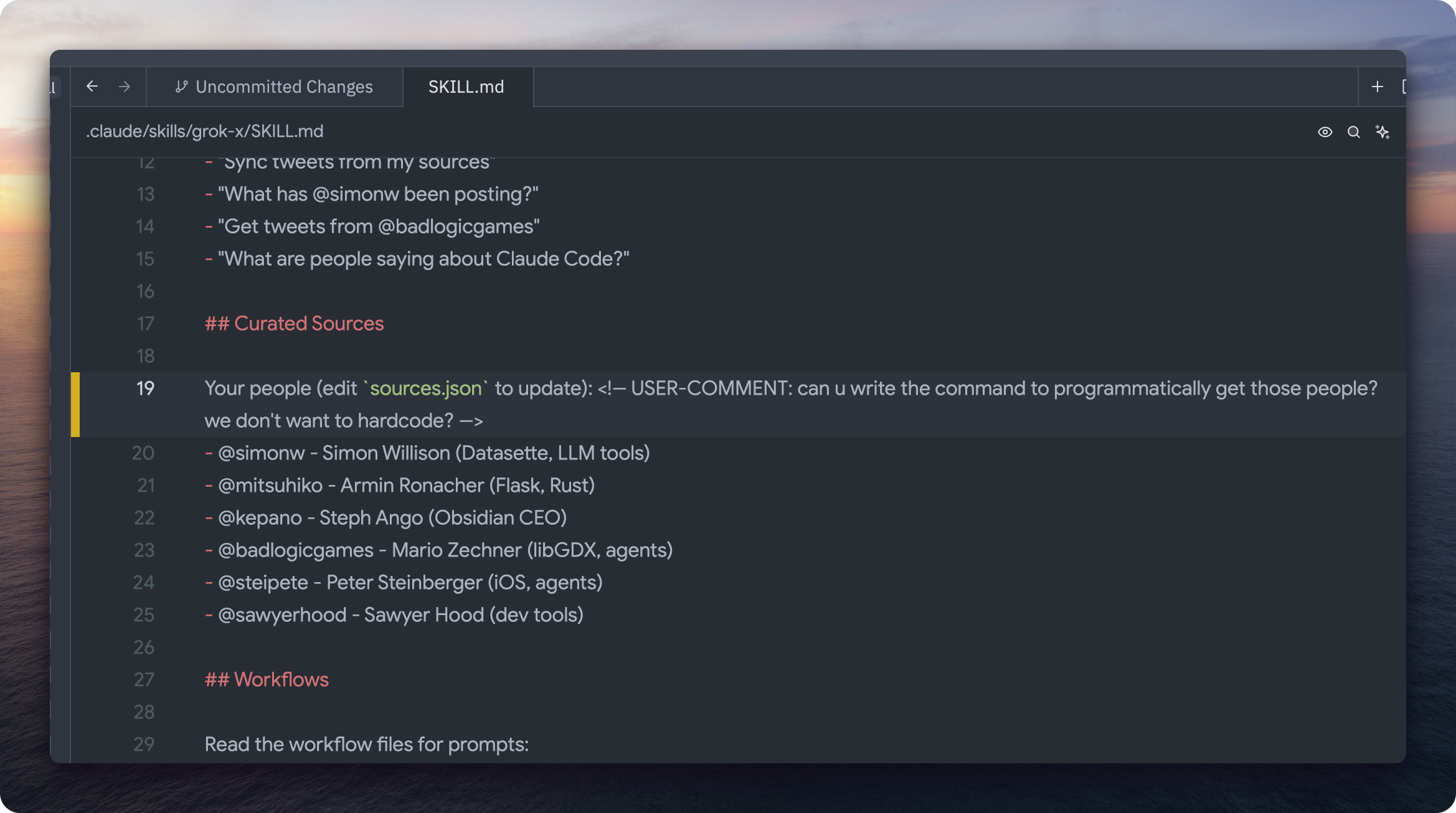 Here’s the flow: I wrote a skill for Twitter which parses sources I follow. Claude didn’t do it in a programmatic way - I just gave a comment to do it programmatically. It wrote a couple lines of Bash to extract the Twitter handles from the file instead of hardcoding.