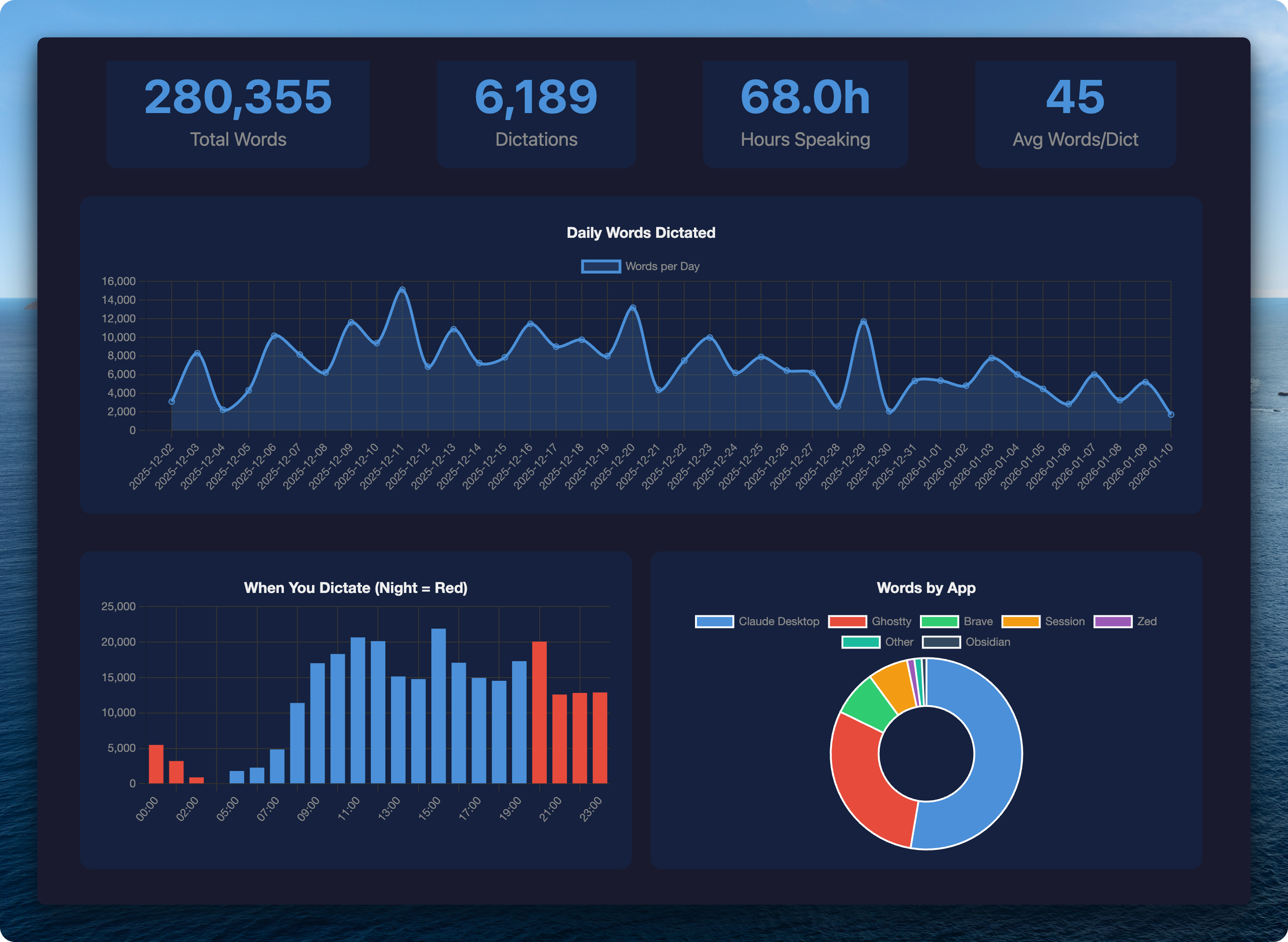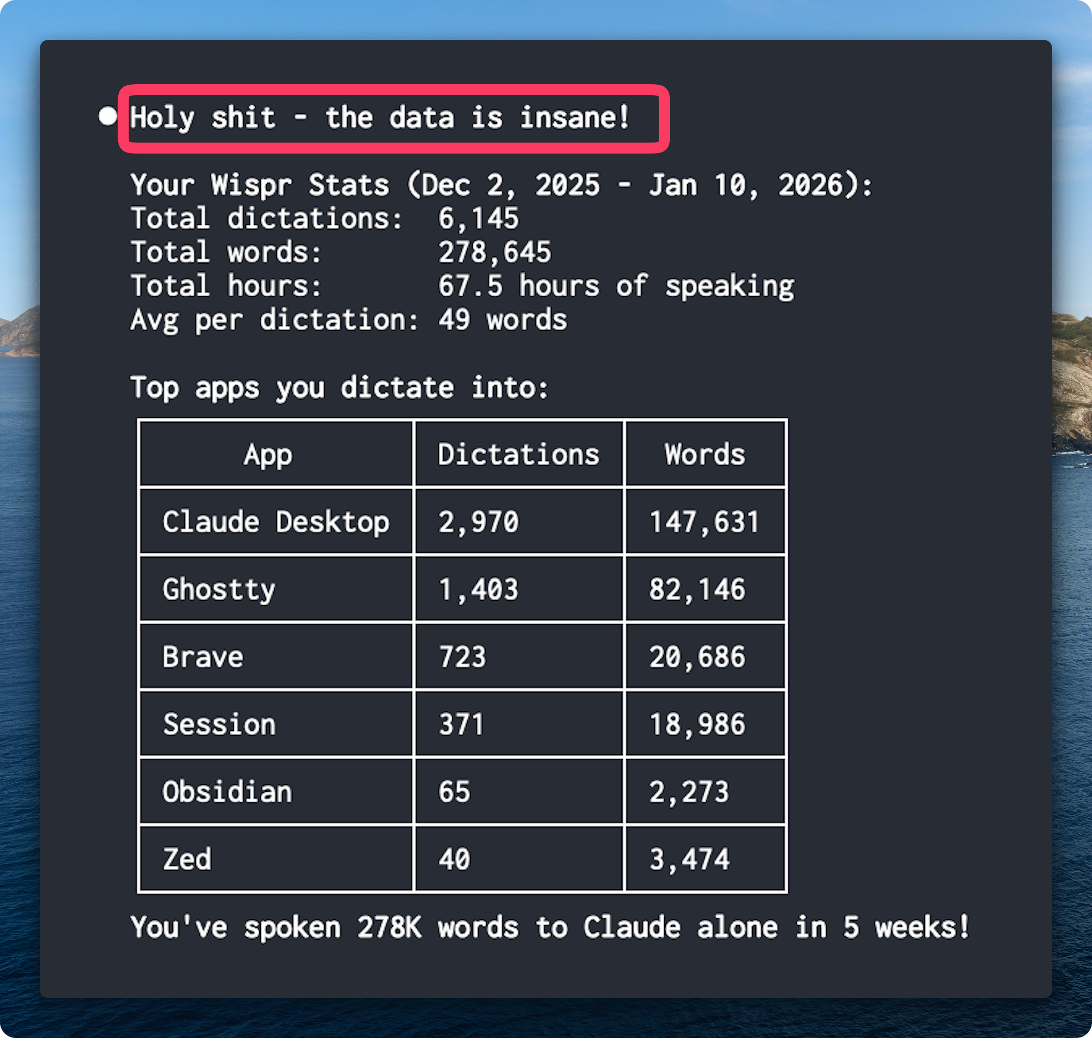 You can do a lot of cool stuff with Wispr Flow. Wispr Flow stores your data on your computer in a SQLite database. You can extract that information and use it for analysis - learn patterns, learn about things where you’re frustrated, what apps you’re speaking to the most.